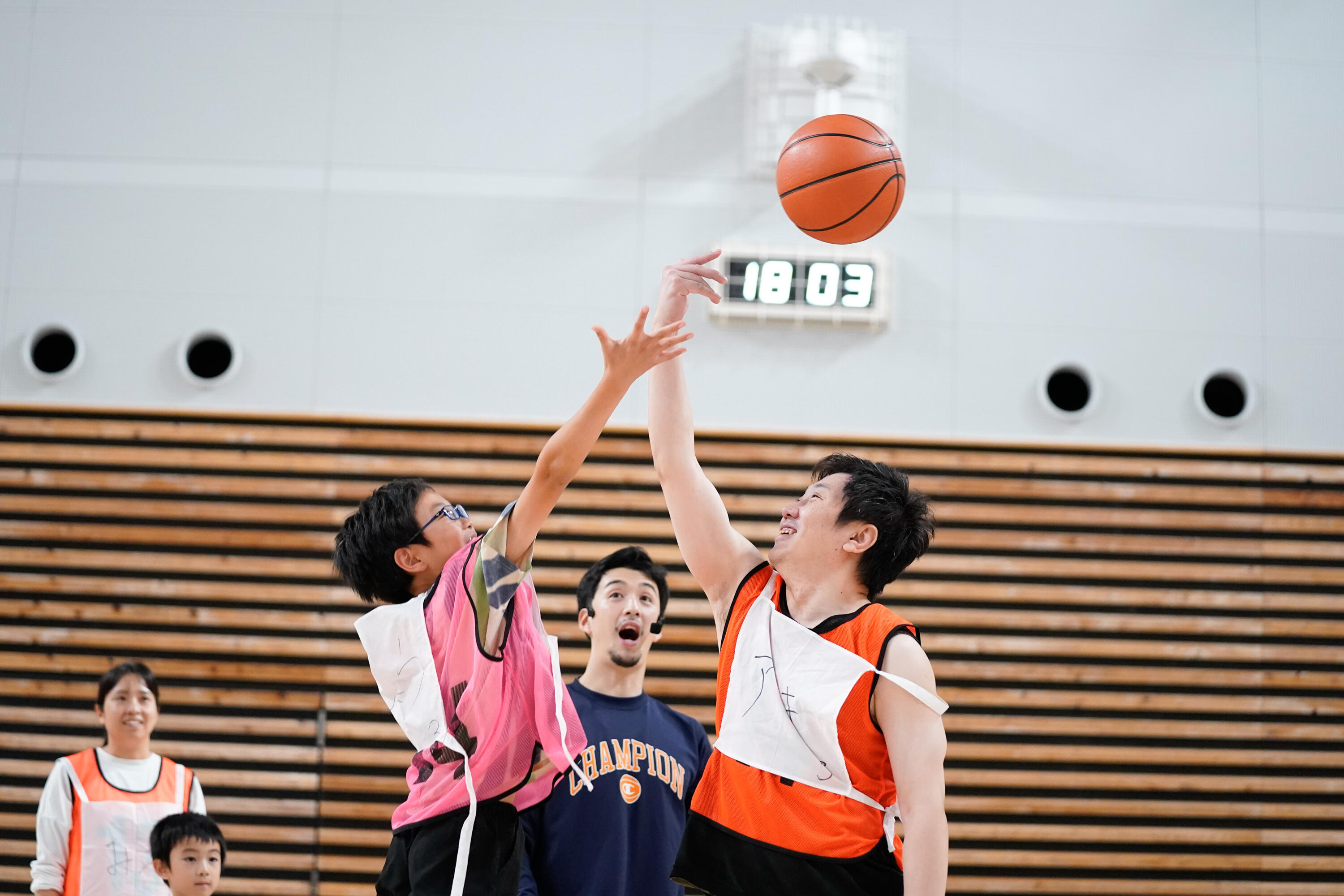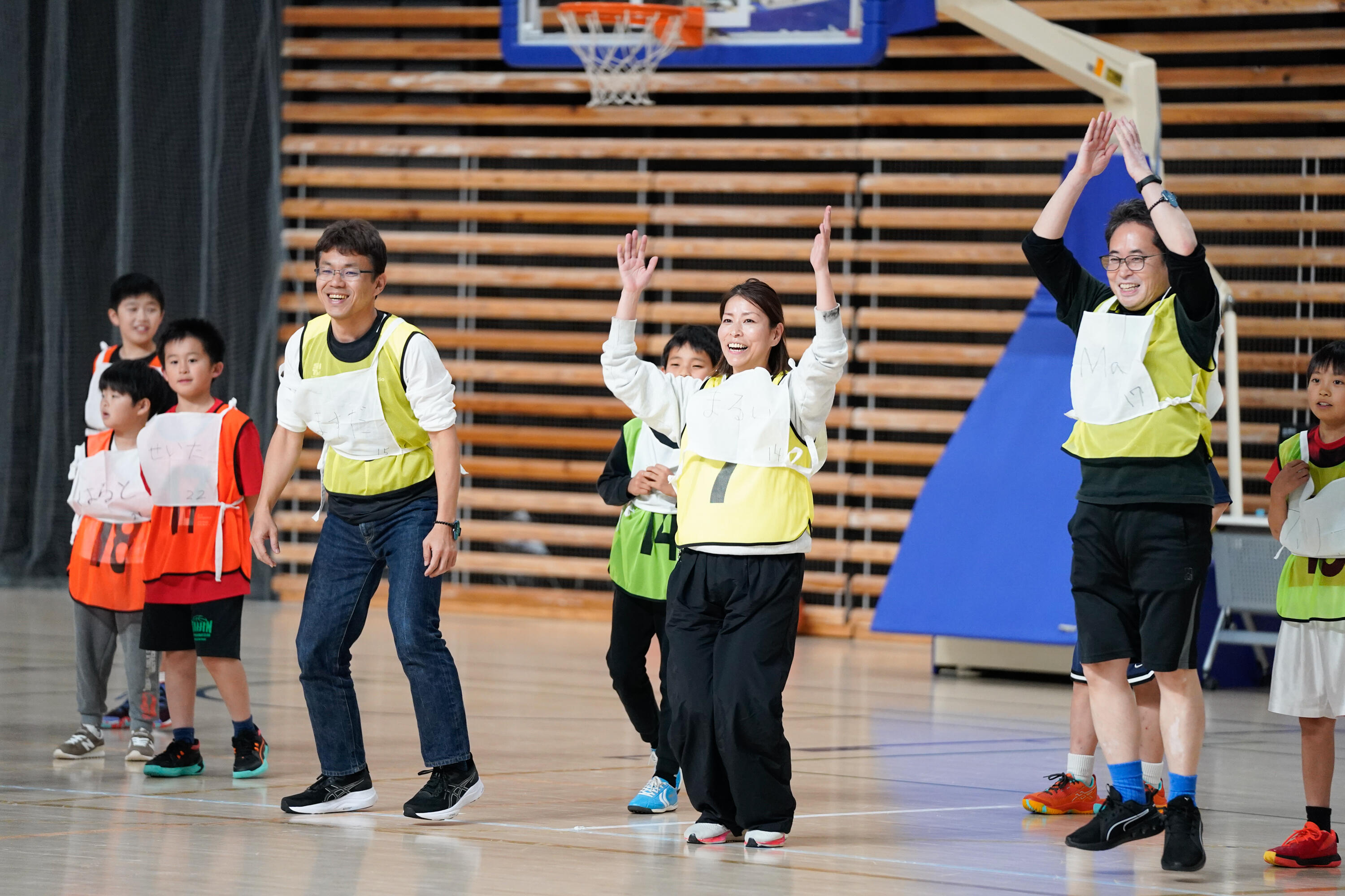 当日は、ウォームアップやドリブルリレー、シュート練習、親子対決、子ども vs 選手など、バスケットボール未経験の方でも参加しやすいプログラム構成で進行。その中で、ゴールが決まった瞬間に親子や仲間で喜び合う姿や、一生懸命声を掛け合う光景が広がり、会場には笑顔と温かい空気が流れていました。