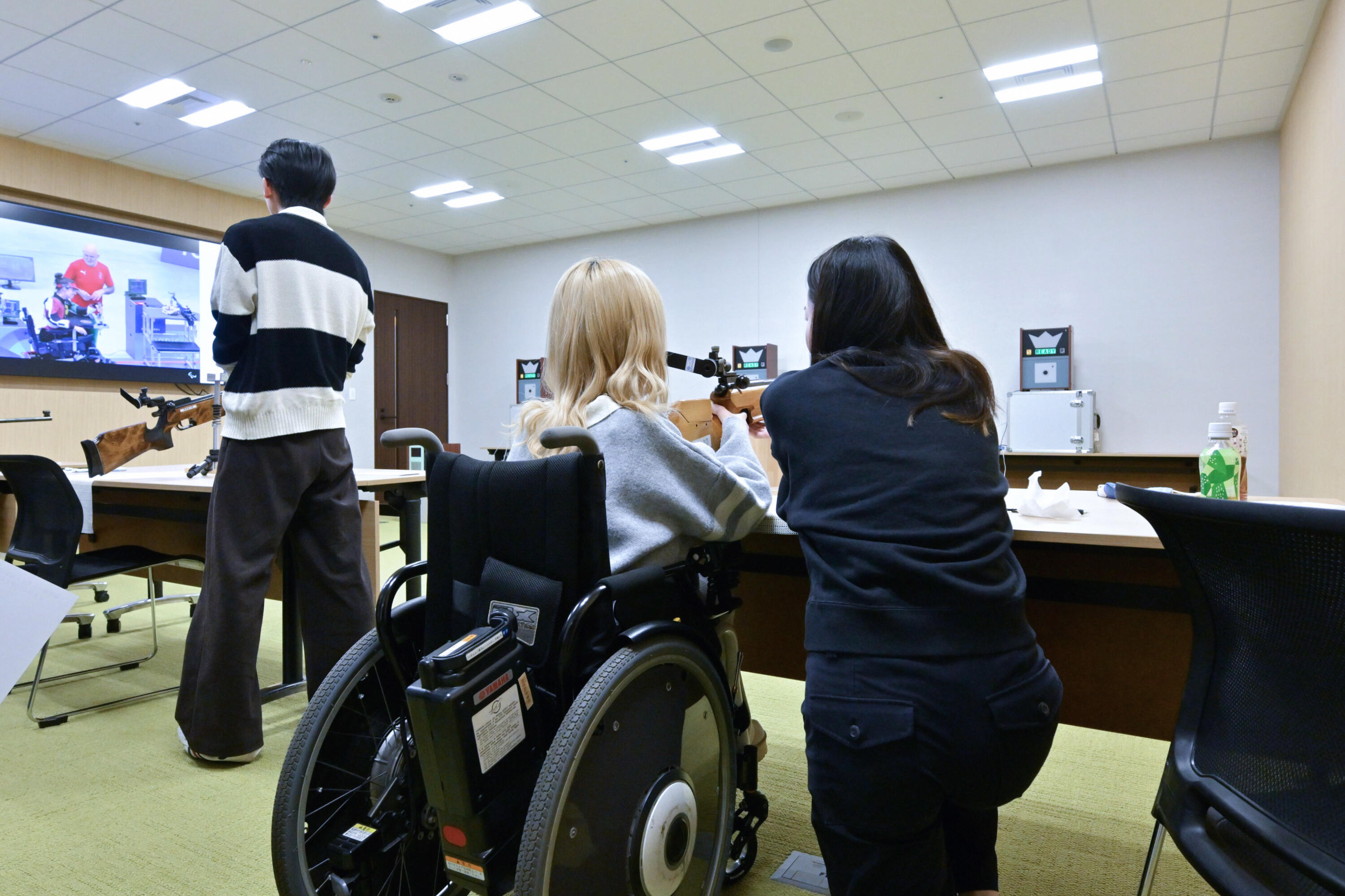プログラムに先立ち、障がい理解のきっかけとして、車椅子バスケットボールとパラ射撃の体験会を開催しました。車椅子バスケットボールはウーブン・バイ・トヨタ所属のパラアスリート・熊谷悟選手、パラ射撃は日本パラ射撃連盟の協力により実施しました。