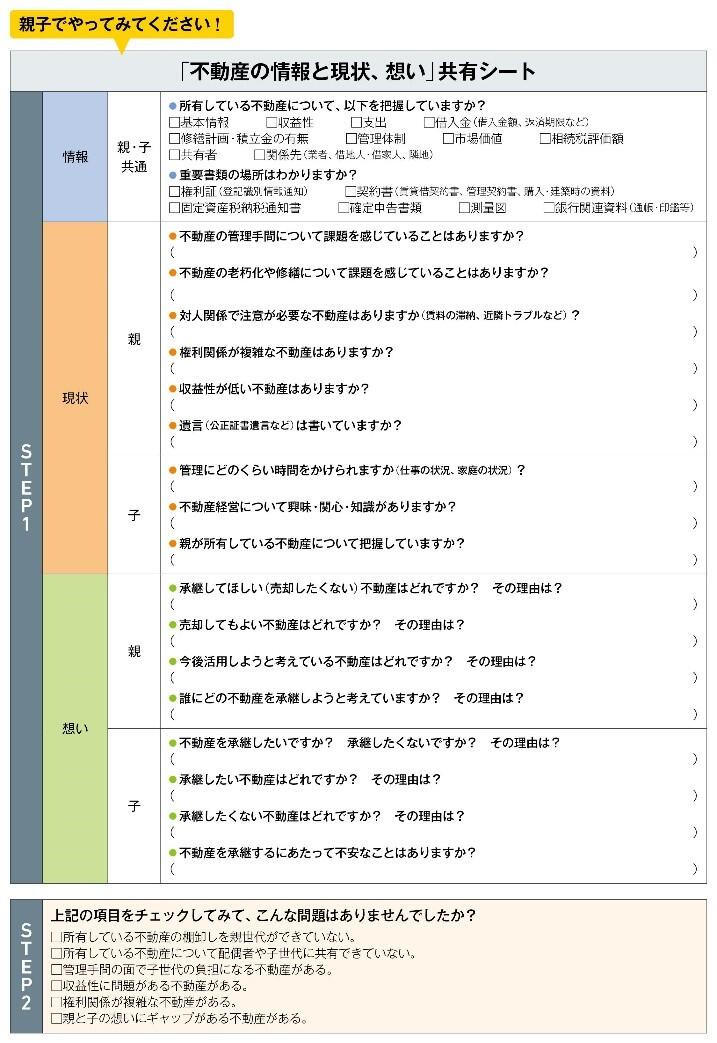STEP1では、不動産の情報と現状、想いを親子で共有します。その際は、前回ご紹介した「子世代が困りやすい不動産の3要素」(❶手間がかかる、❷収益性が低い、❸権利関係が複雑)に該当する不動産の有無を確認しましょう。また、想いを共有する際は、親世代と子世代ではライフスタイルや価値観が異なるということを踏まえ、相手の想いを理解することを心がけましょう。