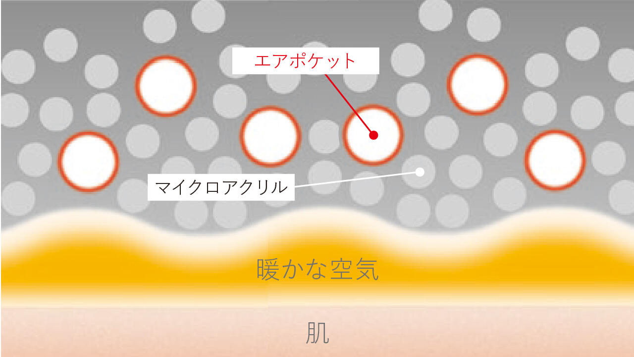 生まれた暖かい空気が、髪の毛の約10分の1という極細アクリル繊維の間にできたエアポケットに閉じ込められることで、高い保温性を発揮しています。