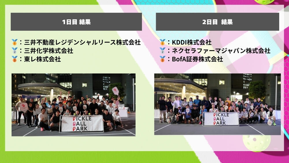 今年度は、例年にも増して注目が高まるピックルボールのイベントを、企業対抗戦という新しい形で各エリアにて開催することとなりました。その記念すべき第一弾として、5月15日・16日の2日間、赤坂サカス広場にて「企業対抗ピックルボール&BIZCUP in AKASAKA」を実施いたしました。