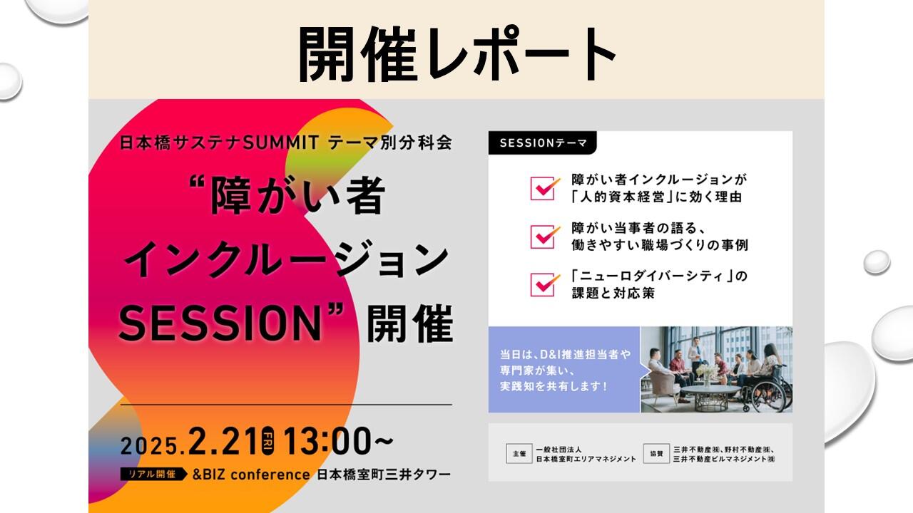 一般社団法人日本橋室町エリアマネジメント(以下、「日本橋室町エリアマネジメント」)は、誰もが働きやすい日本橋を目指し、2025年2月21日に日本橋で働く身体障がい者や企業の人事やD&I担当者と共に、企業のインクルーシブな職場づくりへの貢献を目指した座談会「日本橋サステナSUMMITテーマ別分科会~障がい者インクルージョンSESSION~」を実施しました。