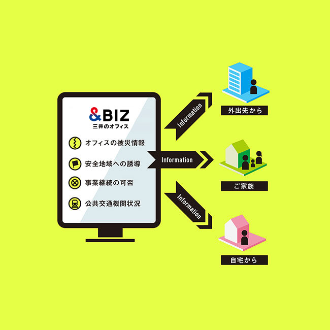 災害時、お客様にとって遠隔地にあるオフィスの迅速な状況把握は大きな課題になります。危機管理センターでは、把握した災害情報のうち、お伝えすべきものについてはウェブサイトなどを通じて発信。『三井のオフィス』で働くみなさまのご家族にもご安心いただけるよう努めています。