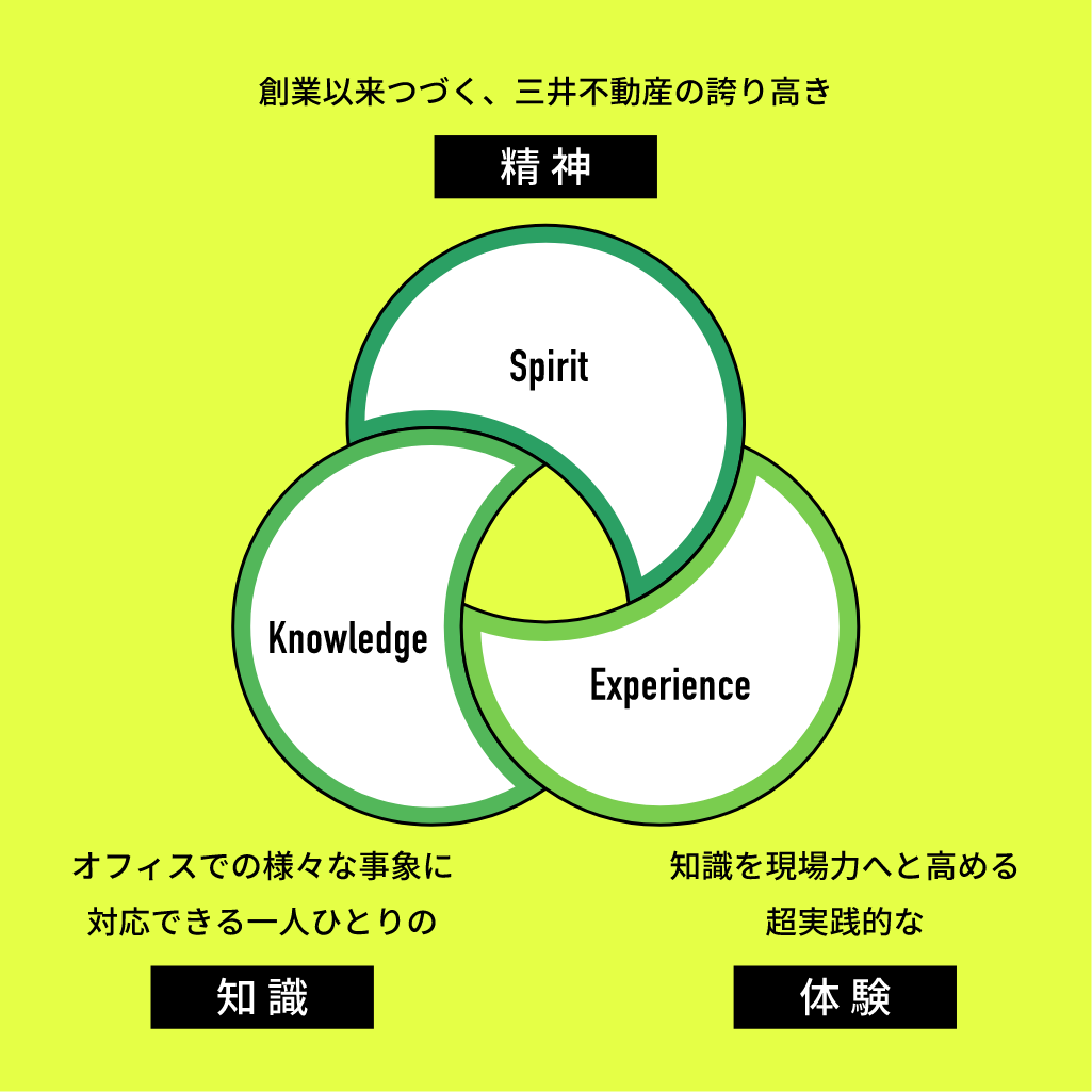 「三井不動産総合技術アカデミー」は「三井のオフィス」が誇るビルマネジメントの「精神」「知識」「体験」を磨く場として設立されました。