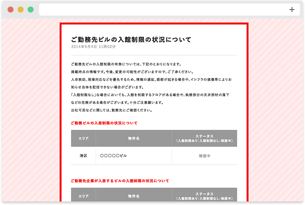 - 入居されているビルによっては、「緊急時の重要なお知らせ」が表示されない場合があります。ご了承ください。